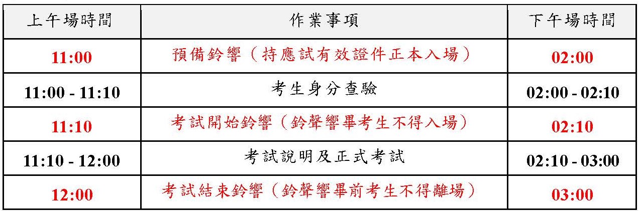 考生之考試場次及試場座位,由本會安排及配置,考生不得指定或要求變更。考試時間表如下表:
