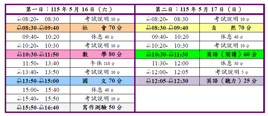 115年國中會考51617日考試 考試時間表如下